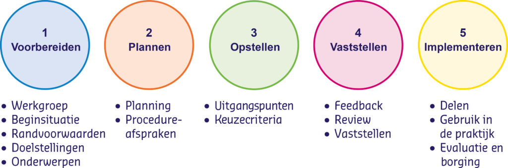 Het opstellen van leermiddelenbeleid hoeft niet groots of ingewikkeld te zijn. Het kan variëren van een korte paragraaf in het schoolbeleid tot een zelfstandig beleidsdocument. Begin klein en bouw voort op ervaring. Je kunt bijvoorbeeld ook beginnen met alleen een lijst met richtinggevende uitspraken of standpunten en deze uitspraken of standpunten eerst toetsen of uitwerken binnen één school, bouw of vaksectie. In dit artikel gaan we dieper in op het proces dat je doorloopt voor het opstellen van een wat uitgebreider leermiddelenbeleid.